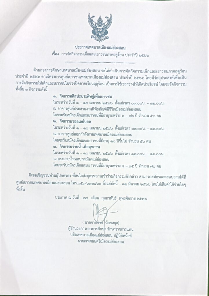 ด้วยกองการศึกษาเทศบาลเมืองแม่ฮ่องสอน จัดกิจกรรมเด็กและเยาวชนภาคฤดูร้อน ประจำปี 2566 ตามโครงการศูนย์เยาวชนเทศบาลเมืองแม่ฮ่องสอน ระหว่างวันที่ 1 – 10 เมษายน 2566 โดยมีกิจกรรมทั้งสิ้น 3 กิจกรรมดังนี้