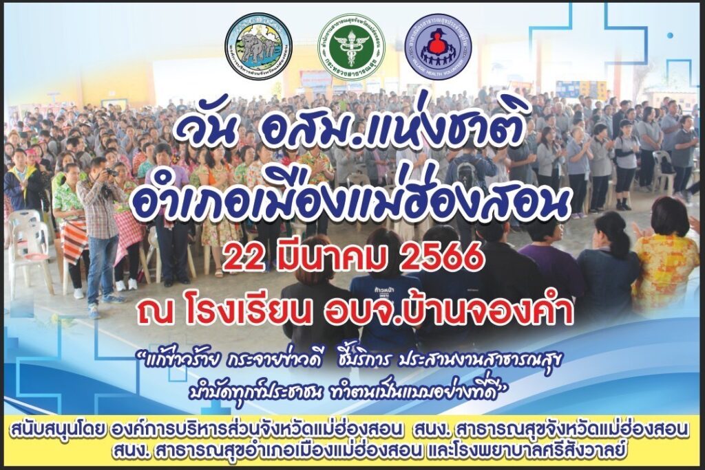 วันที่ 22 มีนาคม 2566 ชมรมอสม.เมืองแม่ฮ่องสอน ร่วมกับ องค์การบริหารส่วนจังหวัดแม่ฮ่องสอน, สำนักงานสาธารณสุขจังหวัดแม่ฮ่องสอน, สำนักงานสาธารณสุขอำเภอเมืองแม่ฮ่องสอน, โรงพยาบาลส่งเสริมสุขภาพตำบล และโรงพยาบาลศรีสังวาลย์ จัดงาน “วันอสม.แห่งชาติ อำเภอเมืองแม่ฮ่องสอน” โดยมีวัตถุประสงค์ เพื่อสนับสนุน เสริมสร้างขวัญกำลังใจ และความสามัคคี ใก้กับอสม.อำเภอเมือง ทั้ง 6 ตำบล ได้แก่ ตำบลจองคำ, ตำบลปางหมู, ตำบลผาบ่อง, ตำบลหมอกจำแป่, ตำบลห้วยปูลิง, ตำบลห้วยโม่ง, ตำบลห้วยผา ซึ่งปัจจุบัน อำเภอเมือง มีอสม. ทั้งหมด 1,055 คน